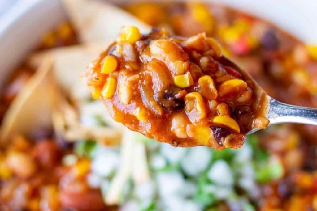 The secret to a delicious, hearty vegetarian chili is giving enough time for all spices and aromatic components to impart their flavors into the broth, achieving a complex and layered flavor profile.