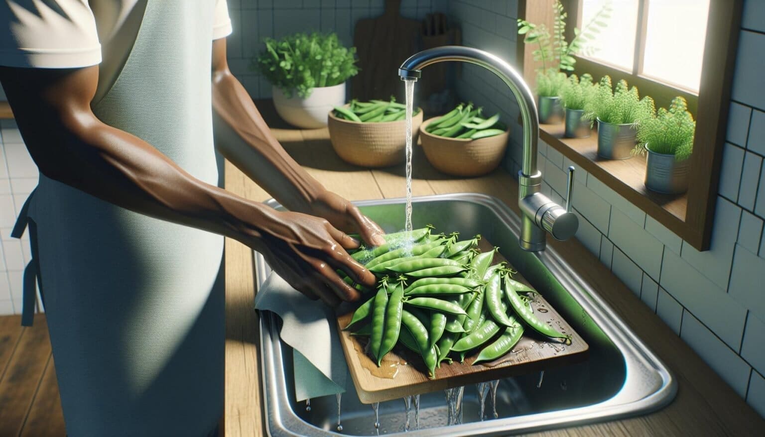 Fresh snap peas require thorough cleaning before freezing. Rinse them under cold running water to remove dirt, debris or garden residue. Hold each pea pod under the stream while gently rubbing the surface with your fingers.