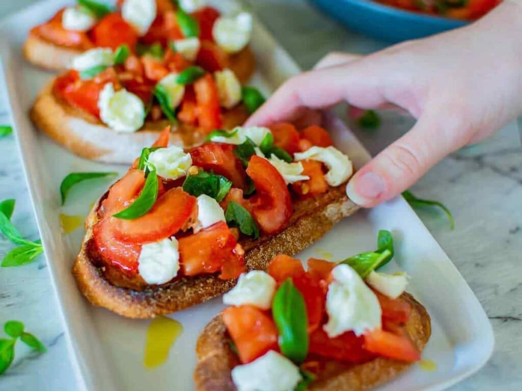 Celebrate the simplicity and charm of Italian cuisine by artfully arranging chopped marinated mozzarella pieces atop toasted slices of baguette, complemented by a spoonful of vibrant tomatoes and a dusting of fresh basil for a delightful variation of bruschetta.