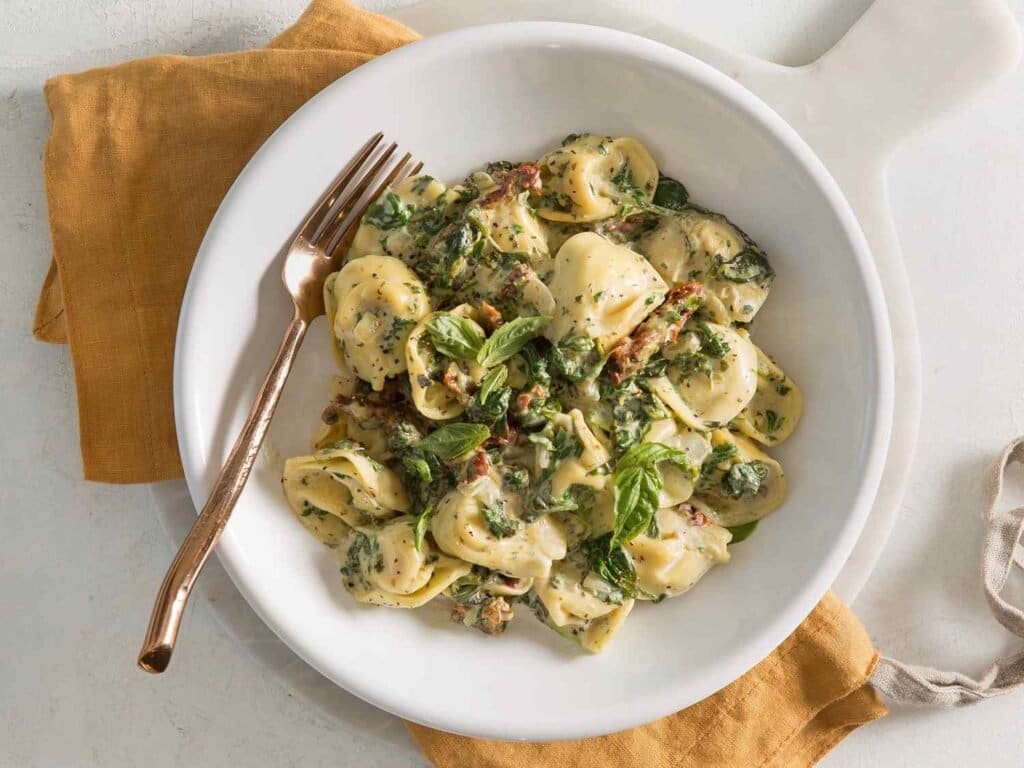 Upgrade your pasta evenings by mixing creamy spinach with gently sautéed onions, garlic, ripe tomatoes, rich whipping cream, and a generous helping of cheese into cooked tortellini, making a dish that’s as comforting as it’s delightful.